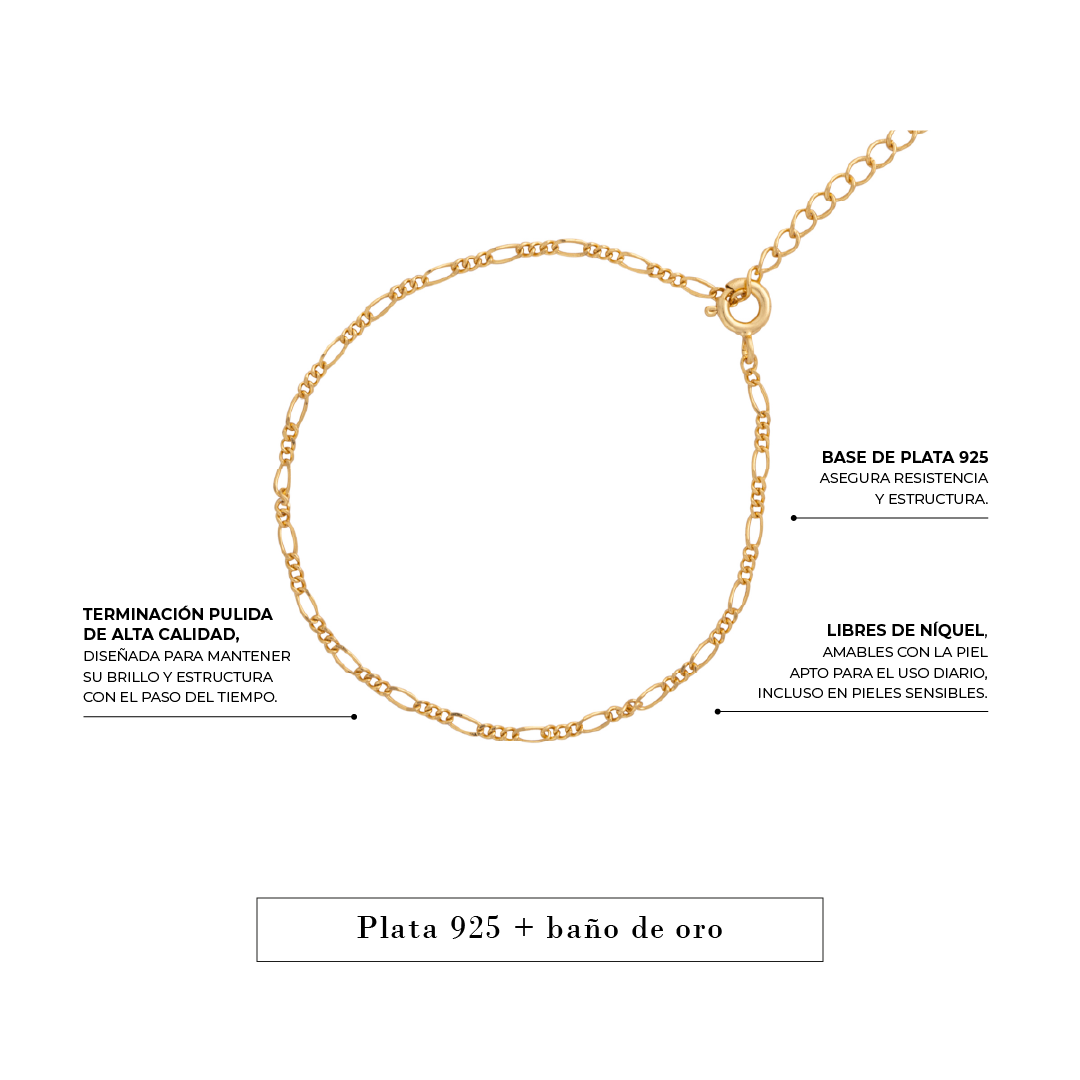Comienza a personalizar tus joyas con la Pulsera Uma. Hecha en plata 925 con baño de oro de 18 quilates, es resistente y duradera para llevar todos los colgantes que quieres combinar.