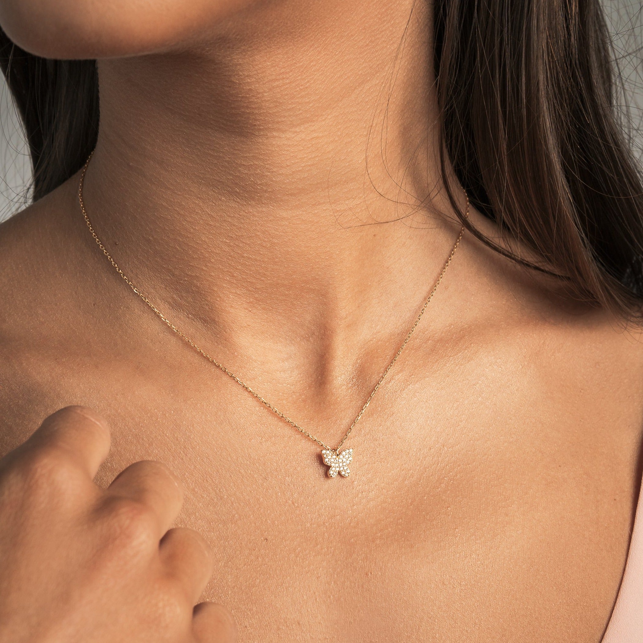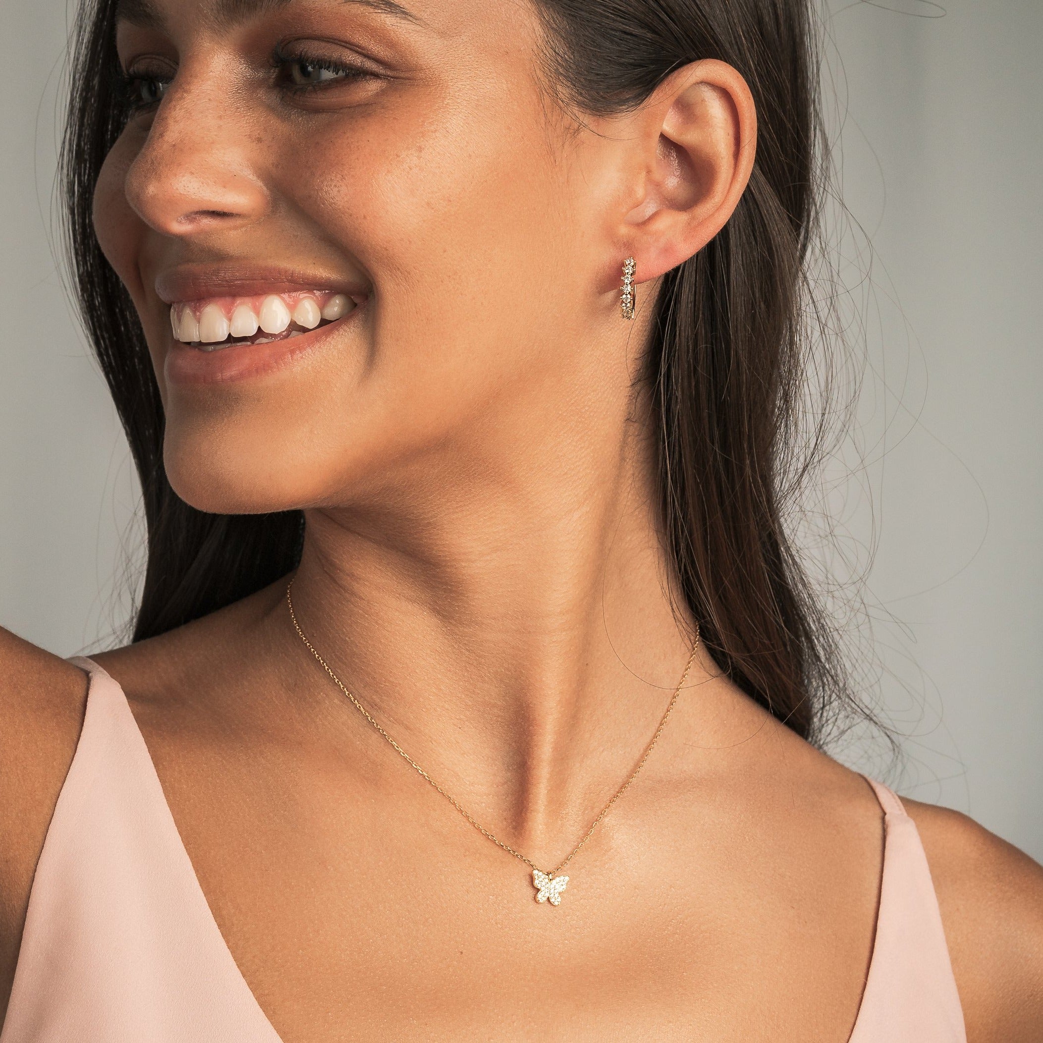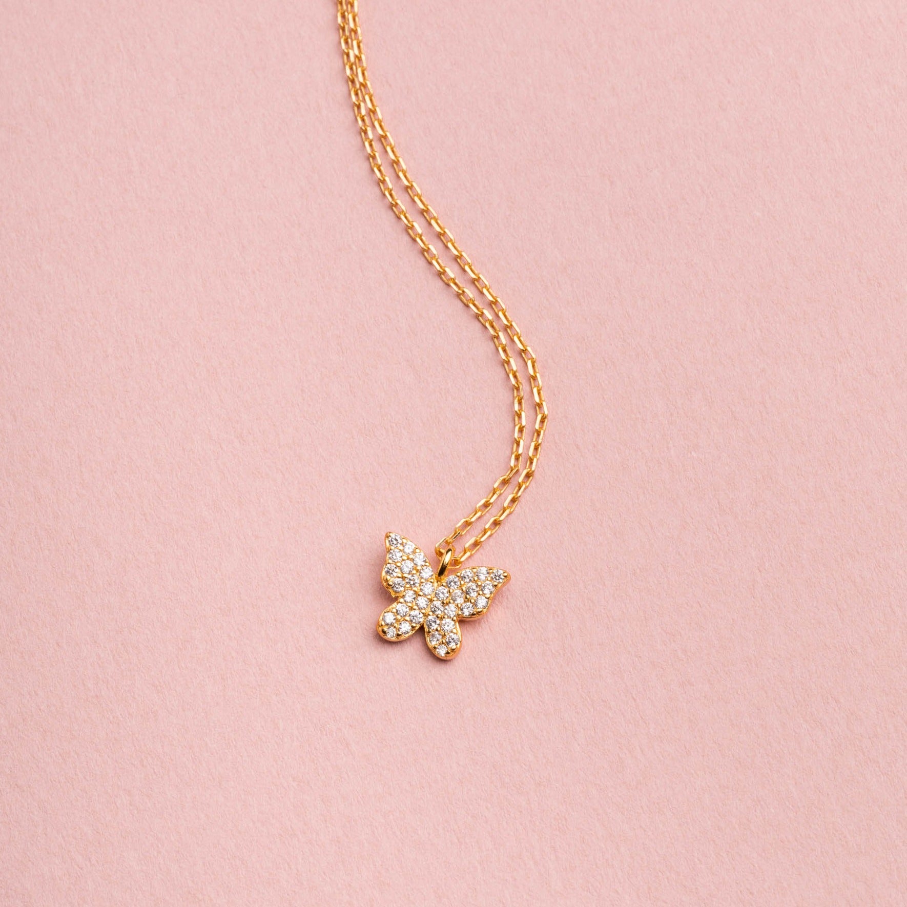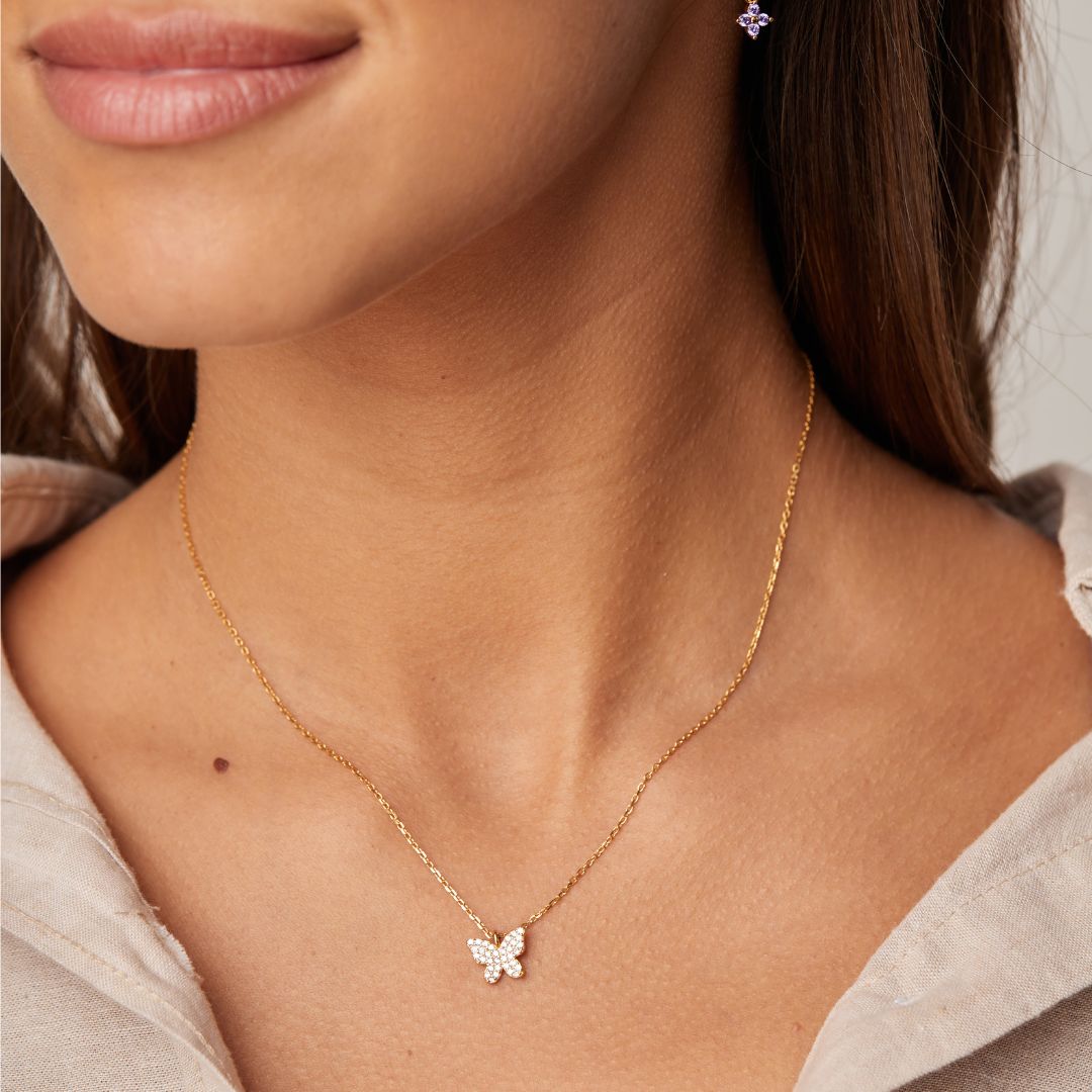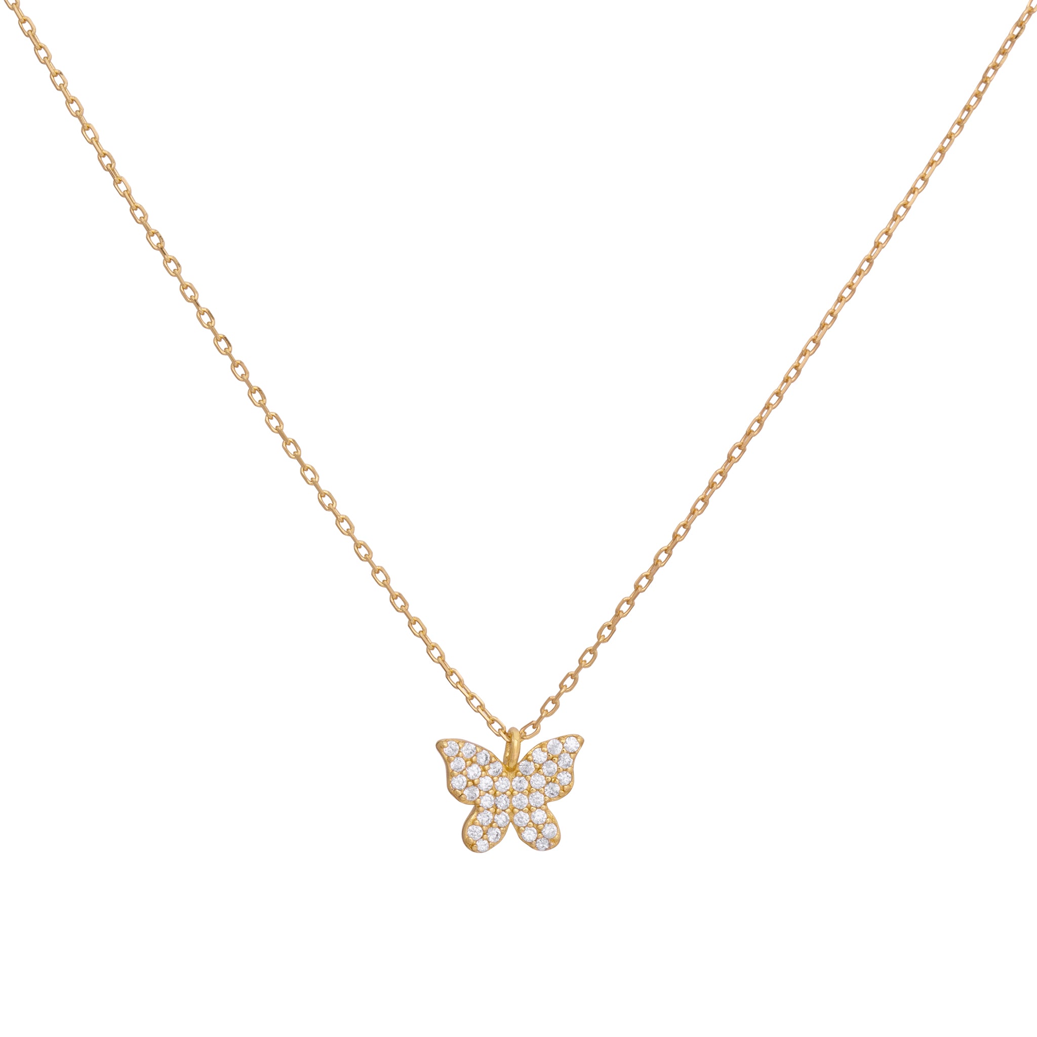 Fabricado en plata 925 con baño de oro de 18 quilates y brillantes circones que dan forma a la mariposa de su colgante. Este es un collar que resalta en todos tus atuendos.