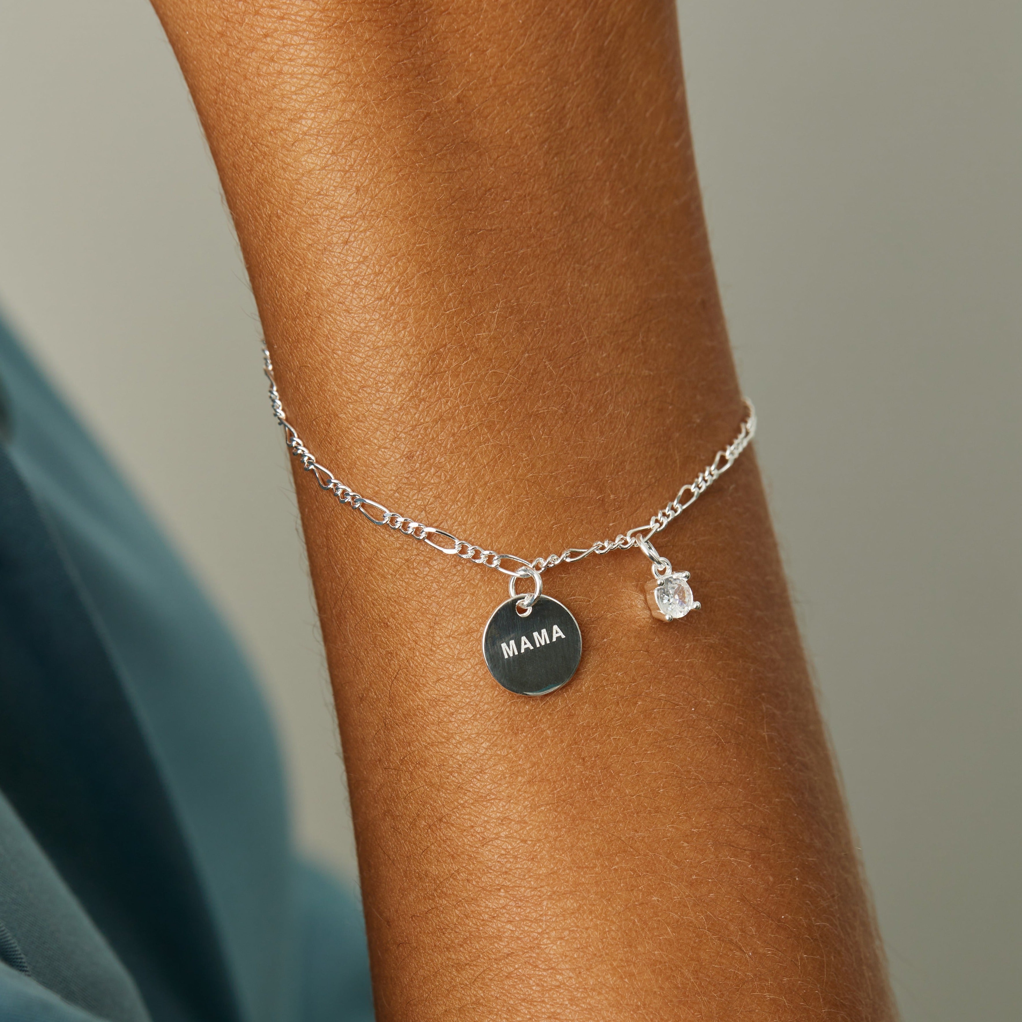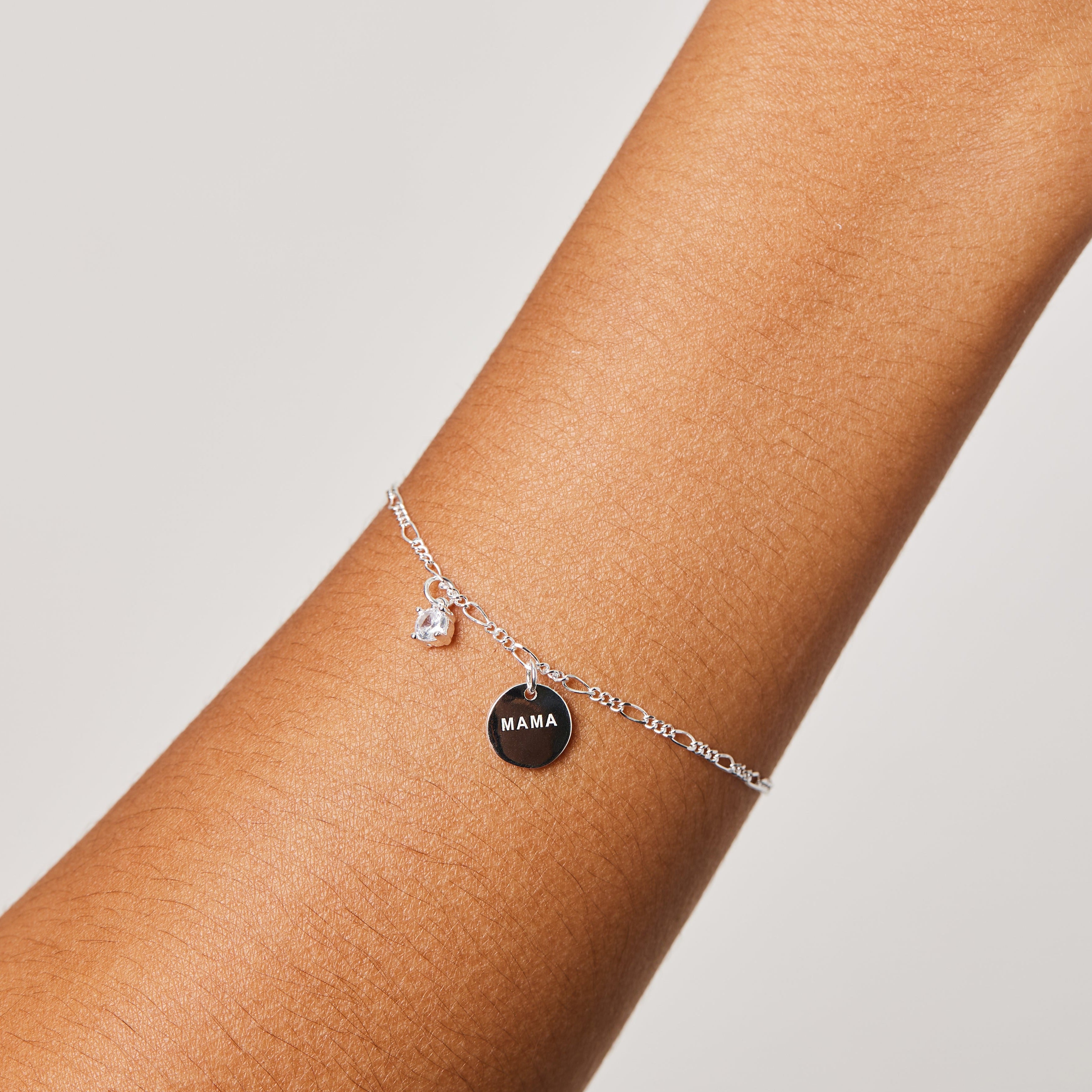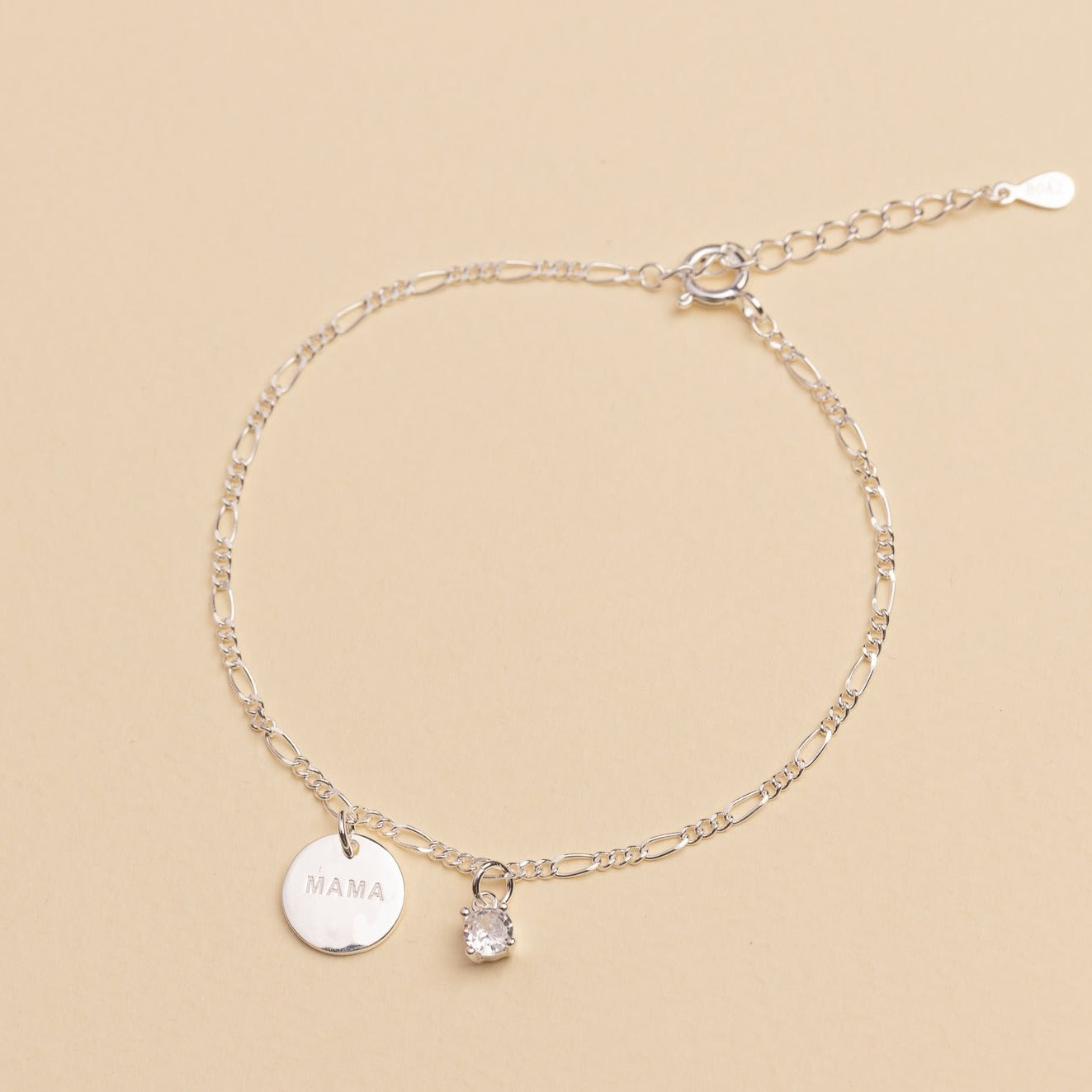 En el centro de la pulsera se encuentra un delicado colgante, grabado con la palabra "Mamá", acompañado de un circón blanco muy brillante.