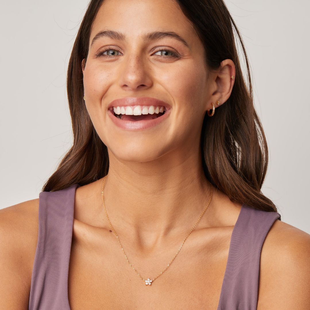 Hicimos este collar en plata 925 con baño de oro de 18 quilates y circones blancos brillantes, perfecto para transmitir tu estilo alegre
