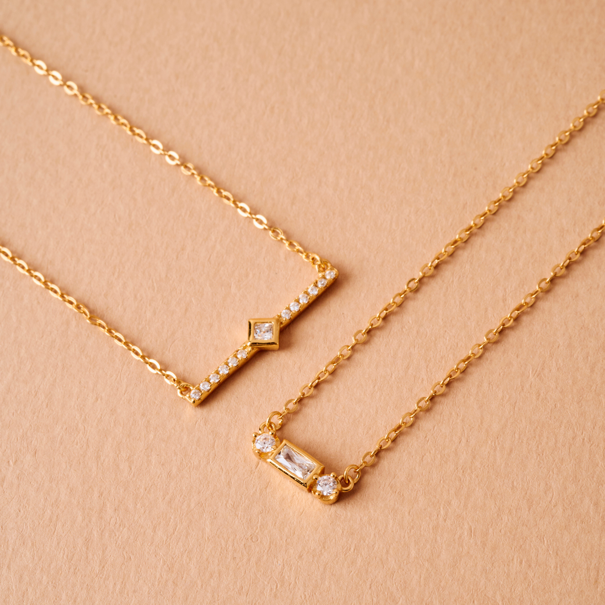 Este collar combina un circon central rectangular en corte baguette con dos circones redondos a cada lado, creando una pieza delicada pero con presencia.